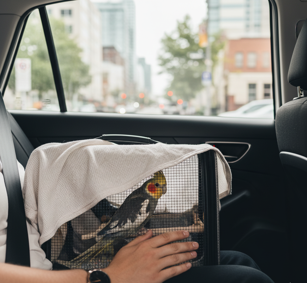 Choose a carrier appropriate for your bird’s size—small birds need cozy spaces, larger parrots need room to move slightly.