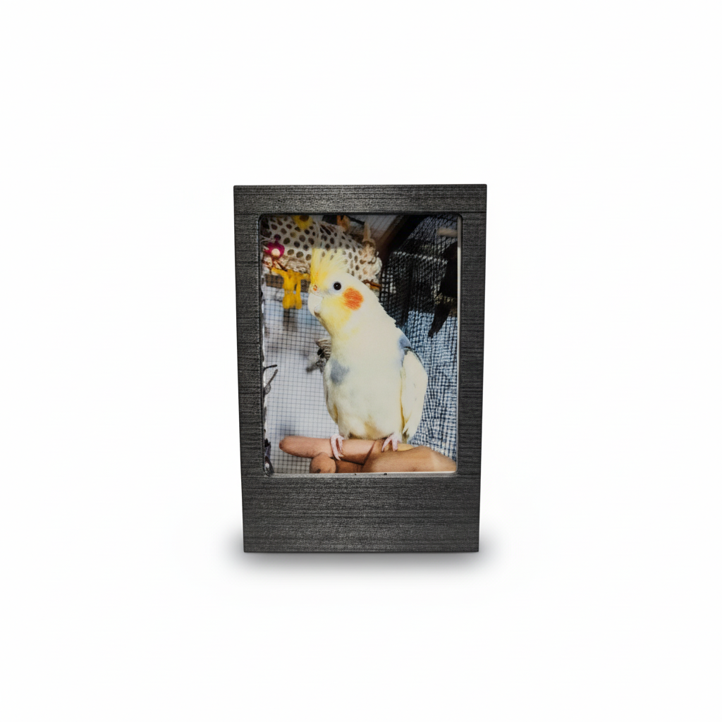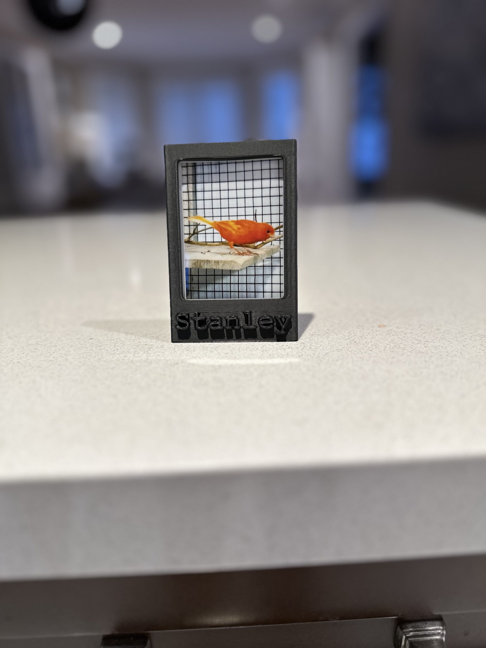 A Polaroid of your bird in a frame, customizable with its name engraved for an additional $5.