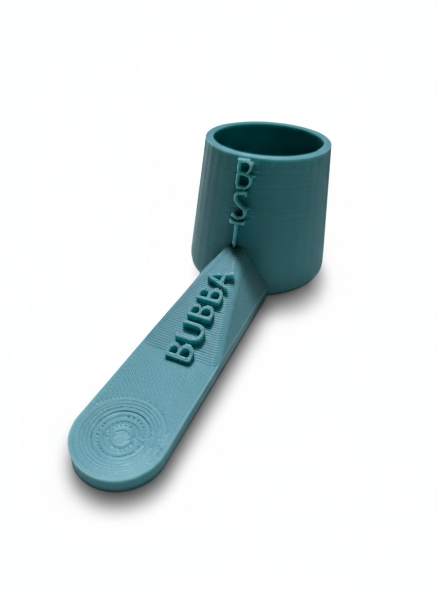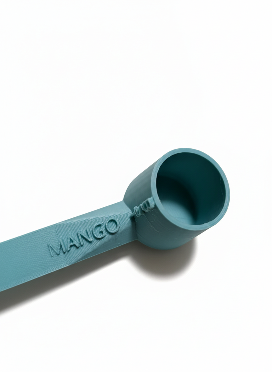 A personalized engraved scoop for feeding your bird, conveniently stored in the food bag.